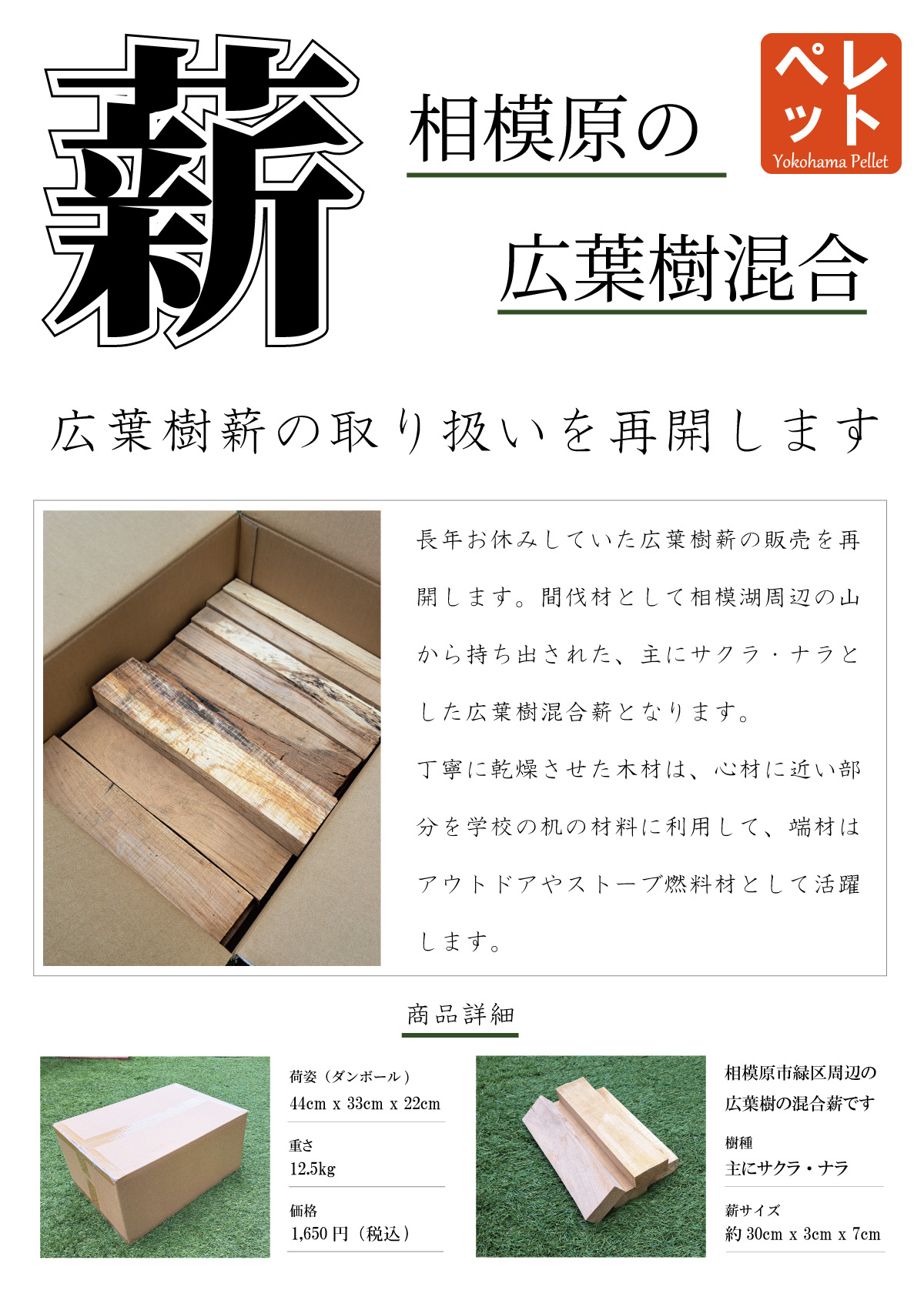 保管しやすく持ち運びが簡単な箱入りの相模原の広葉樹混合薪は、約12kg/箱で販売します。当面の間は横浜のペレット販売所で数量限定の販売となりますので、ご来店時には在庫のご確認をお願い致します。輸送費の高騰の影響で商品と近い金額が送料に必要な時代になっており、遠方のお客様には申し訳ございませんが、広葉樹薪の希少性や地産地消の観点からもネット通販(発送)での取り扱いは検討中です。